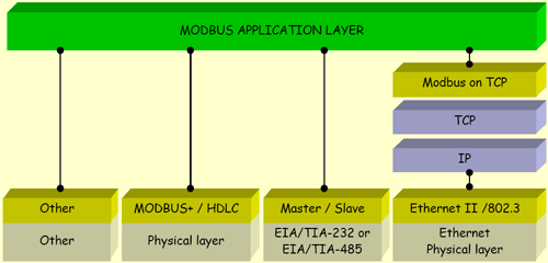 其中: ◆傳輸標識符:用于標識應用數據單元,即請求和應答之間的配對;客戶端對該部分進行初始化,服務器端將其拷貝到自己的ADU中; ◆協議標識符:系統間的協議標識,0=Modbus; ◆長度:接下來要發送的數據長度,即:單元標識符 PDU的總長度,以字節為單位; ◆單元標識符:用于系統間的站尋址,比如在以太網 串行鏈路的網絡中,遠程站的地址; 這就是Modbus TCP的ADU結構,即:MBAP頭 PDU,是不是很簡單呢?Modbus TCP的數據傳輸采用的是一種被稱為“客戶端/服務器”的模式,這也是上面的表格中會出現客戶端/服務器功能描述的原因。其實,很多網絡通信都采用的這種方式,比如西門子的S7通信協議。在串行鏈路中,這種方式也稱為主-從通信。 在Modbus在網絡通信中,通常需要寫明IP地址和端口號,為什么Modbus TCP的ADU中沒有相關的內容呢? 其實這是因為Modbus TCP是一個應用層的協議,通常意義上的IP地址和端口號屬于傳輸層/網絡層的協議: